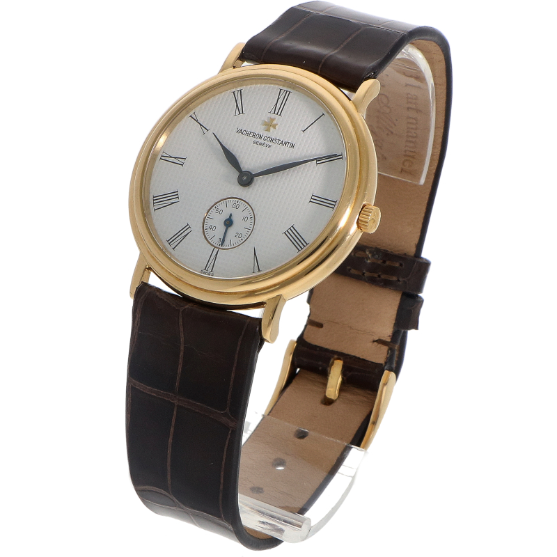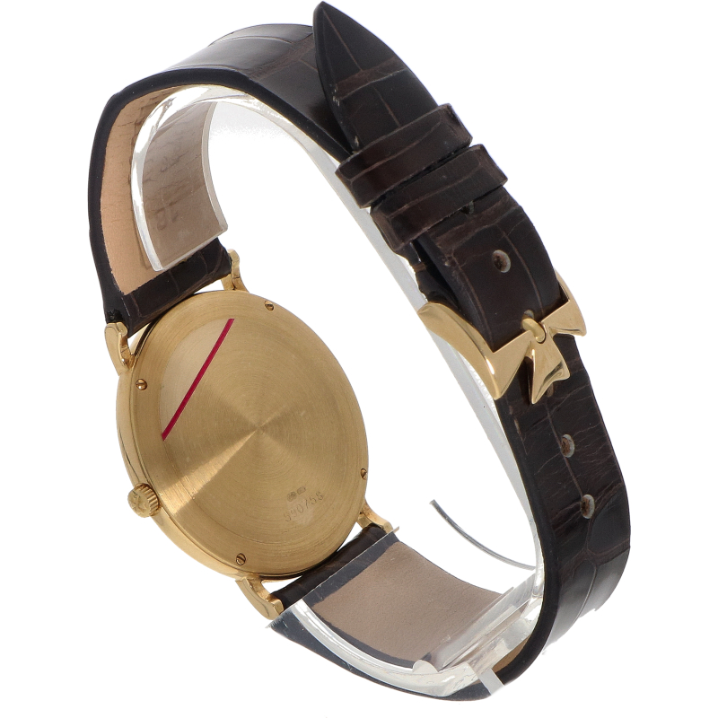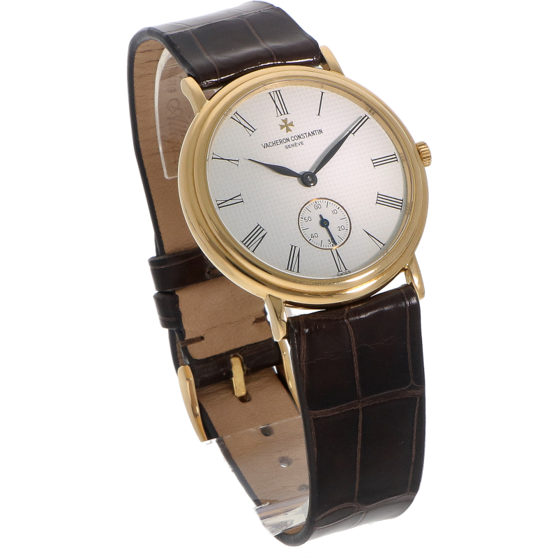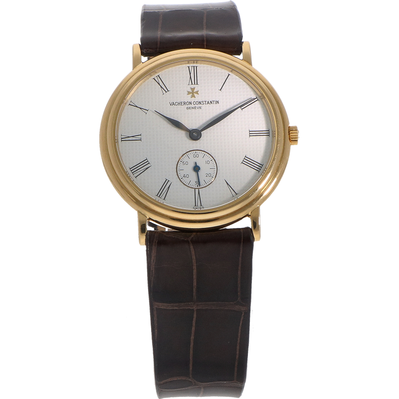 Dit horloge stamt uit de tijd waarin Vacheron Constantin zich richtte op ulytadunne, tijdloze ontwerpen. De kast is uitgevoerd in 18-karaats geelgoud en heeft een bescheiden diameter van 33mm. Het horloge is voorzien van een minimalistiche witte wijzerplaat met een ‘Clous de Paris’ patroon en elegante Romeinse uurmarkeringen. De kleine seconde bevindt zich op de 6- uurs postie. Het horloge wordt aangedreven door een handopwind uurwerk en wordt geleverd op een nieuwe lederen band.